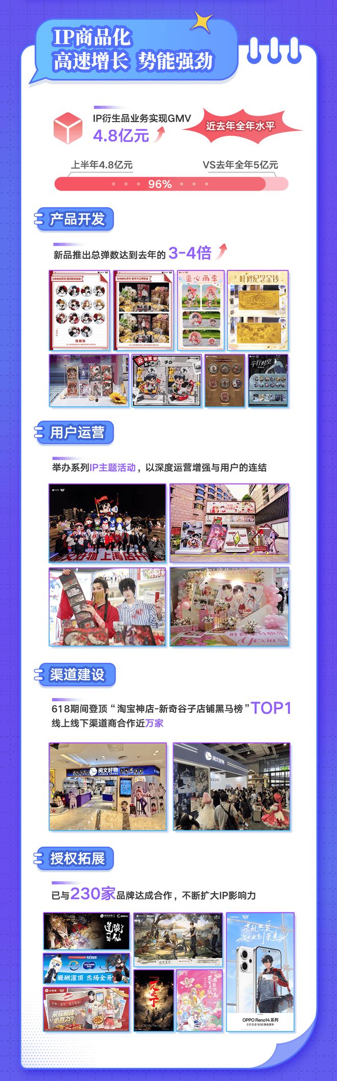 同樣,閲文的IP衍生品業務也展現出了極強的增長勢能,上半年GMV高達4.8億元,接近去年全年水平。快速增長的背後,是閲文好物在產品力、渠道力、運營力及授權拓展等方面的持續深耕。產品開發方面,閲文好物在原畫、設計和工藝等全鏈路上取得了突破,新品推出速度達到去年的3-4倍;渠道建設方面,閲文好物已與近萬家線上線下渠道商合作,其天貓旗艦店在618期間登頂“淘寶神店-新奇穀子店鋪黑馬榜”榜首;用户運營方面,閲文好物通過深度運營增強與用户的連結,圍繞《全職高手》《詭秘之主》《道詭異仙》等頭部IP舉辦主題活動,備受粉絲歡迎;授權拓展方面,閲文好物已與230家品牌達成合作,進一步擴大了IP影響力。