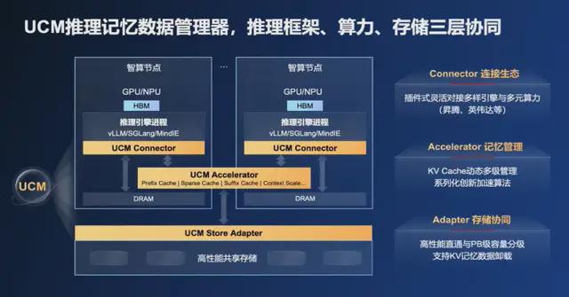AI 推理系統的記憶主要分為三部分:高性能緩存 HBM、內存 DRAM,這兩部分基本都在計算服務器中;還有一部分是過去未被充分利用的專業共享存儲。UCM 推理記憶數據管理器通過一系列算法,將推理過程中不同延時要求的數據放在不同的記憶體中。即時記憶數據放在 HBM 中,短期記憶數據放在 DRAM 中,長期記憶數據與外部知識放在SSD中,以此極大提升整個系統的效率和 AI 推理性能。