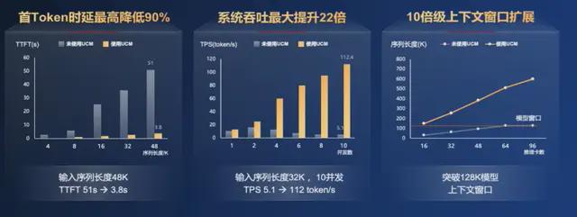 經大量測試和銀聯實際案例印證,該算法能使首 Token 時延最高降低 90%,系統吞吐率最大提升 22 倍,同時上下文推理窗口可擴展 10 倍及以上,極大提升了推理系統的效能。