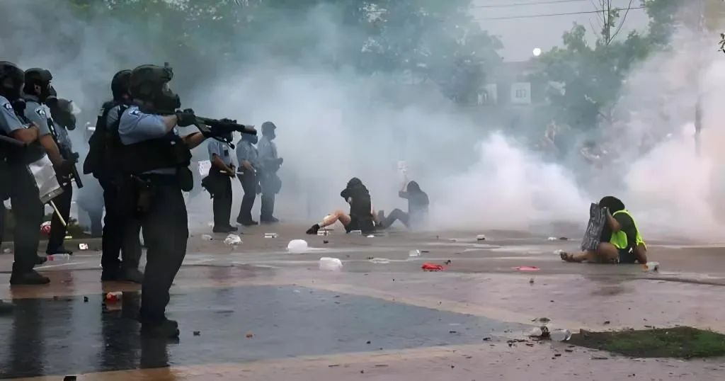 無獨有偶,類似的狀況同樣發生在2020年來越發頻繁的鎮壓事例當中。2020年5月,明尼阿波利斯市警察因過度執法導致非裔美國公民喬治·弗洛伊德死亡。當月,美國全境爆發大規模抗議,並在明尼阿波利斯、洛杉磯、亞特蘭大等地迅速演變為攻擊執法單位、洗劫店鋪的暴亂。在形勢升級的趨勢下,明尼蘇達州、加利福尼亞州、密蘇里州等40個州的州長同時派遣了國民警衞隊協助當地警方控制局勢、鎮壓暴動。抗議者和國民警衞隊在多個城市爆發了直接衝突:示威者用石子、水瓶等投擲物攻擊執勤人員,並高喊反對口號“國民警衞隊,滾回家去”“結束軍事管制”。