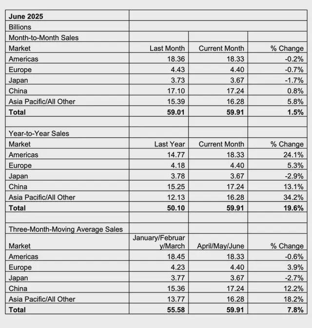近日,美國半導體行業協會(SIA)宣佈,2025年第二季度全球半導體銷售額達1797億美元,同比增長近20%,環比增長7.8%。2025年6月,全球銷售額達599億美元,較2024年6月的501億美元增長19.6%,較2025年5月的銷售額增長1.5%。