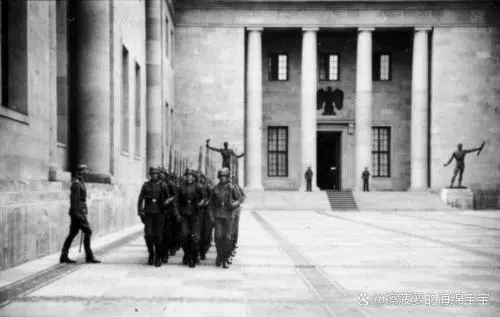 中間兩根石柱前由兩名希特勒警衞旗隊衞兵站崗。主門上面是一個攏翅鷹徽。