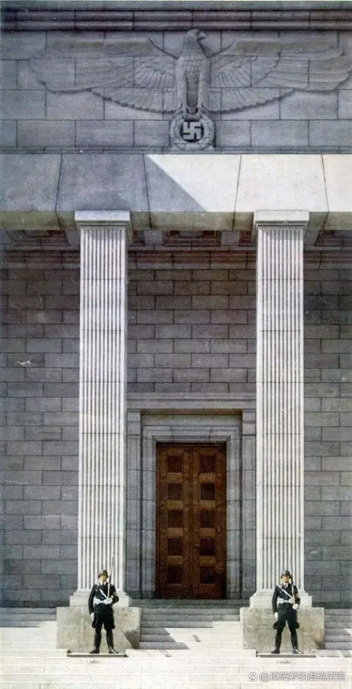 中間兩根石柱前由兩名希特勒警衞旗隊衞兵站崗。主門上面是一個攏翅鷹徽。