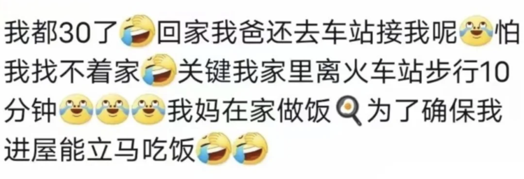 還有東北人説,自己哪怕已經30歲了,每次回家都像小學生放學一樣,爸爸親自到車站接車,然後媽媽提前在家做好飯,自己一到家便能吃上一頓熱騰騰的飯菜。