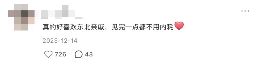 這或許就是為什麼,東北人總是大方、熱情且善良,因為他們從小到大,都有一整個家族在背後撐腰,有錢便給錢,沒錢便給予愛,這是他們闖蕩四方的底氣。這份綿綿無期限的愛,更是讓他們認為,世界應該都是這般互相關愛的,所以熱情也好、熱心腸也罷,也都是耳濡目染下的本能。