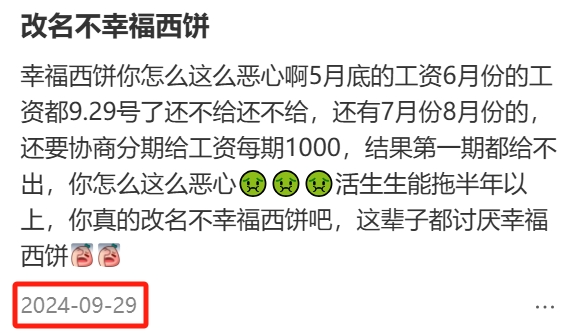 去年9月,也有網友發帖聲討幸福西餅,稱5月底的工資9月底了還沒給,乾脆“改名不幸福西餅吧”。