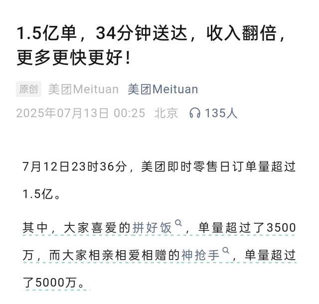 上個月,美團核心本地板塊CEO王莆中接受晚點LatePost公開訪談,就直接指出,整個即時零售的市場總量從年初的日均1億單翻至上週六(7月12日)的2.5億單,這其中絕大部分都是泡沫。