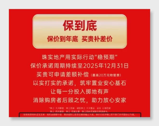 近日,廣州市屬國企珠實地產的一項舉措引發了廣泛關注——旗下7個主力樓盤高調啓動“保價行動”,承諾“買貴補差價”,保價週期橫跨數月,直至2025年12月31日。這一行動,看似簡單的價格保障承諾,實則背後藴含着複雜的市場邏輯與企業考量。
