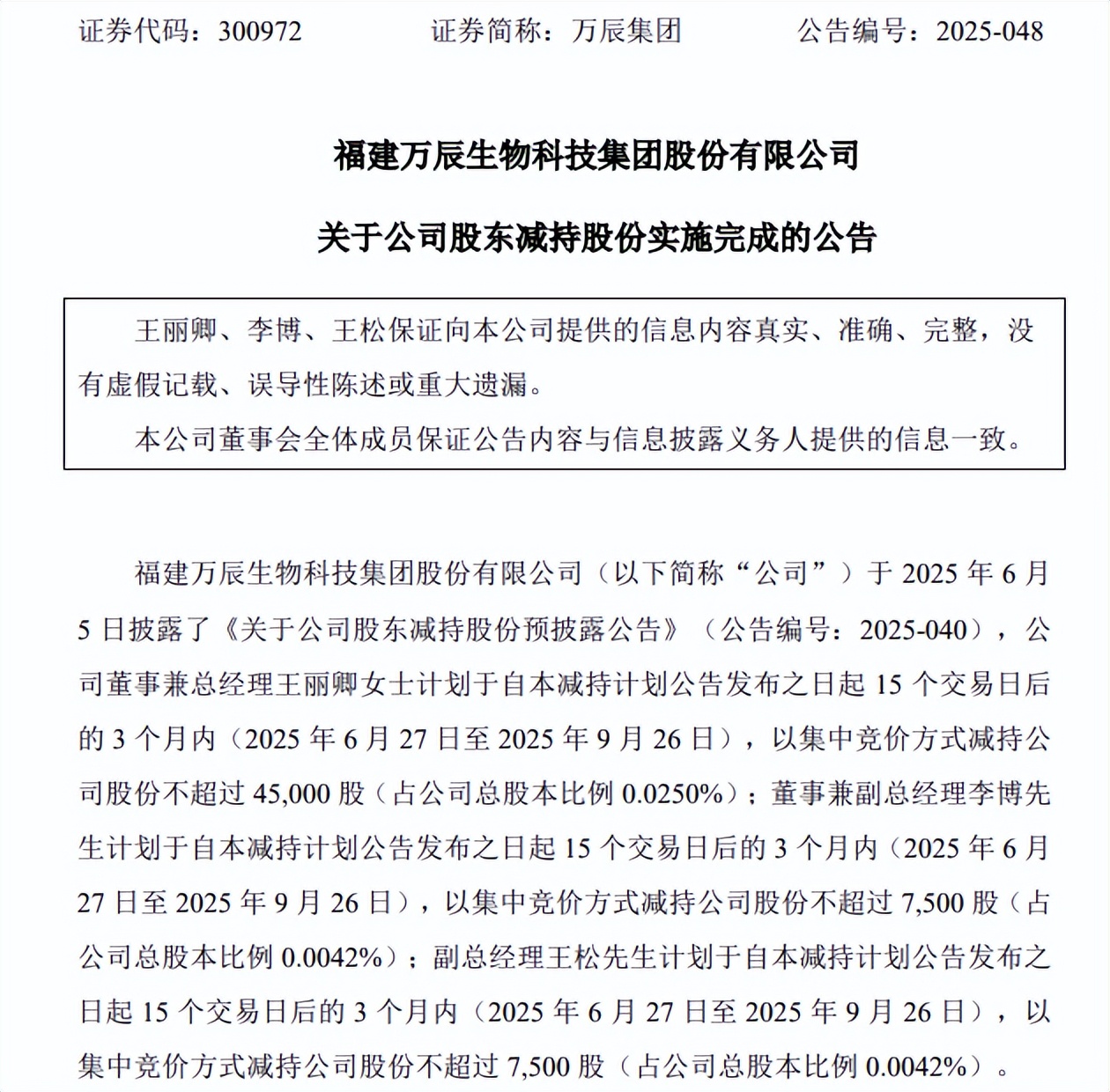 值得一提的是,今年6月以來,萬辰集團公告核心股東減持事宜。6月5日公告中指出,(時任)總經理王麗卿、副總經理李博、副總經理王松計劃減持所持股票。減持數量分別為4.5萬股,0.75萬股、0.75萬股,原因均為個人資金需要。