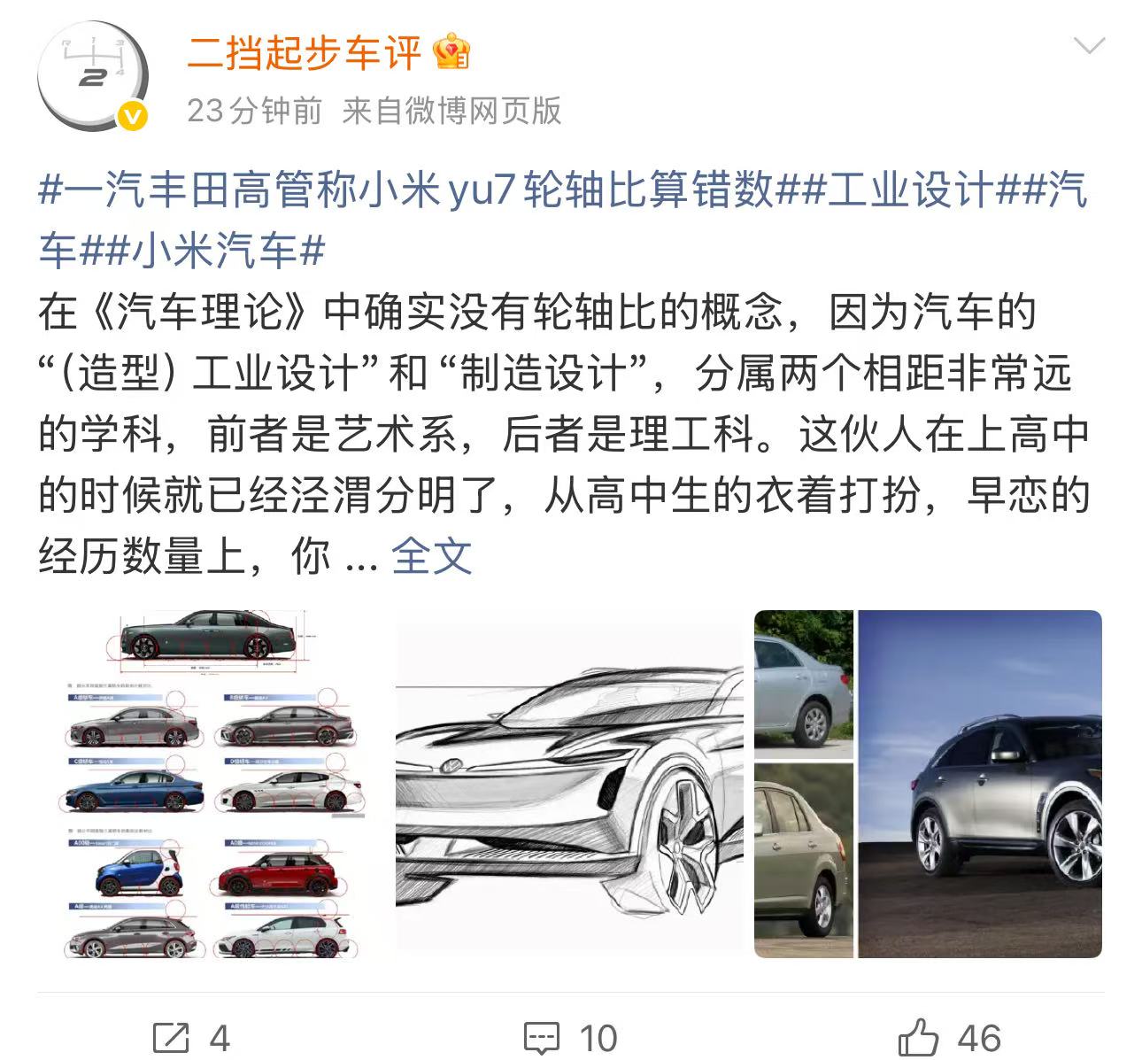 有自稱瞭解汽車工業、美學兩門學科的汽車博主@二擋起步車評 表示,“輪軸比”是確實存在了很久的概念,而雷軍是首次將這個概念概括為“輪軸比”三個字。