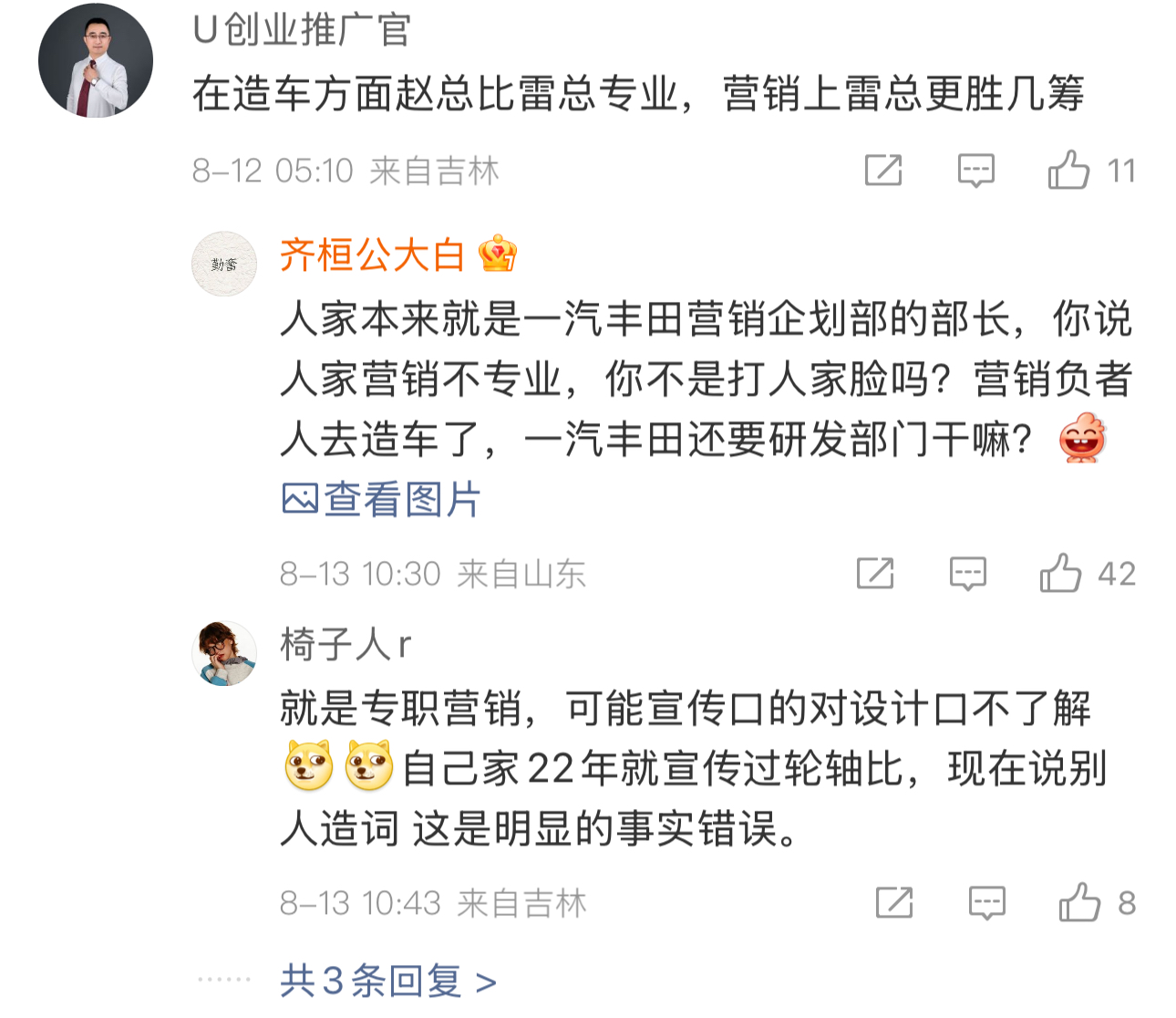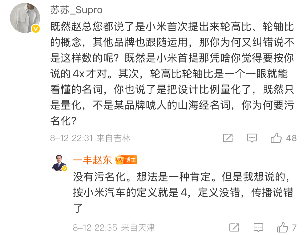 有人質疑雷軍提出“輪軸比”是為了營銷,但也有人反駁説@一豐趙東 的認證信息顯示,他本來就是一汽豐田負責營銷的領導。
