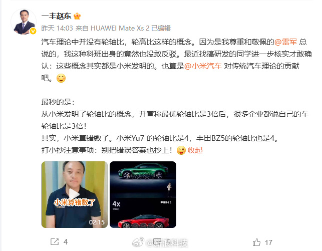 如何看待一汽豐田高管稱小米YU7輪軸比算錯數,但很多車企都用了同樣的概念?_風聞
