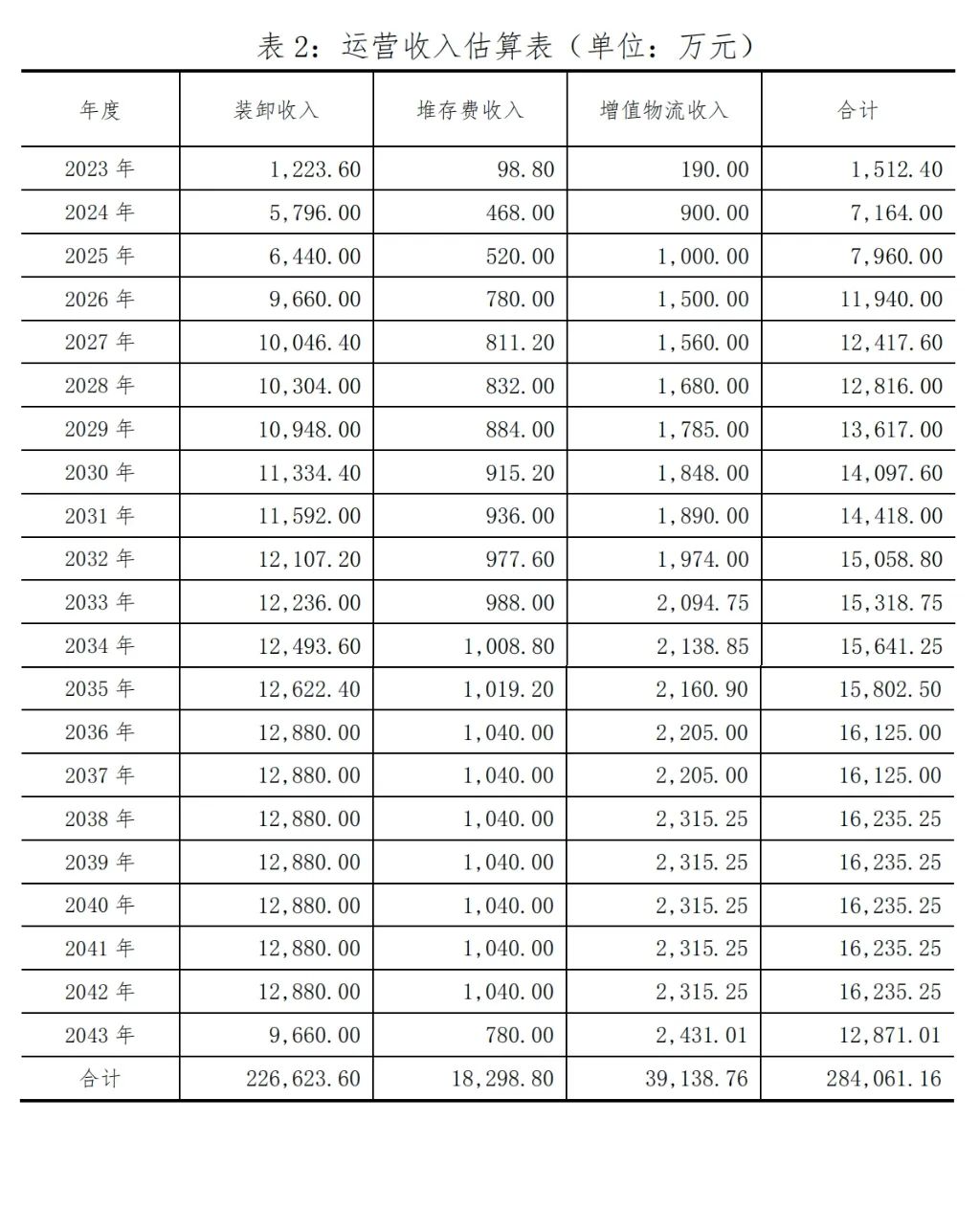 山東濟寧龍拱港是全國首個實現“無人智能運輸常態化運行”的內河集裝箱港口,根據龍拱港對外披露的相關文件顯示,龍拱港4#-10#泊位建設總投資8.06億元,建設7個2000噸級泊位及配套設施,其中多用途泊位4個,通用泊位3個,設計年吞吐量為集裝箱40萬TEU、件雜貨120萬噸。根據測算,達產後裝卸年收入預期(從2036年起)可達1.28億元,堆存收入達1040萬元,增值物流收入達2000萬元,預計2027年起能夠實現穩定盈利。