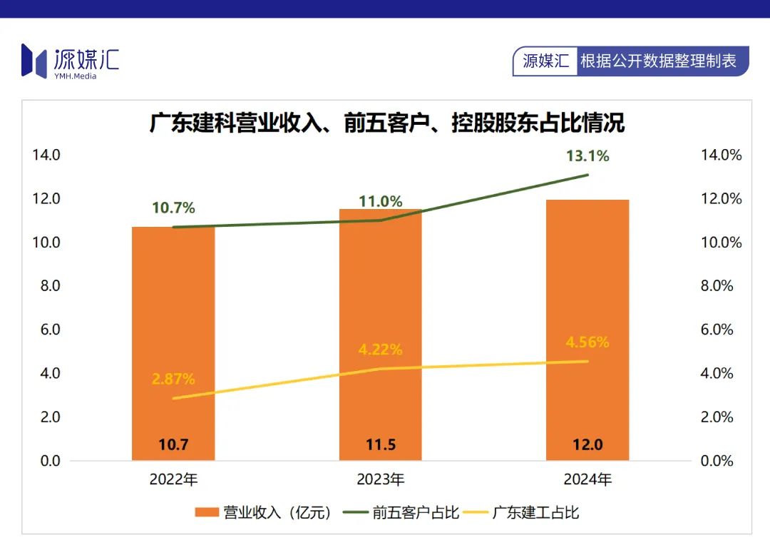 但廣東建科的關聯交易問題未能完全解決,近幾年呈現上升趨勢。上述同期,來源於前五大客户的佔比從10.7%上升至13.1%,來源於廣東建工的收入佔比從2.87%增至4.56%。