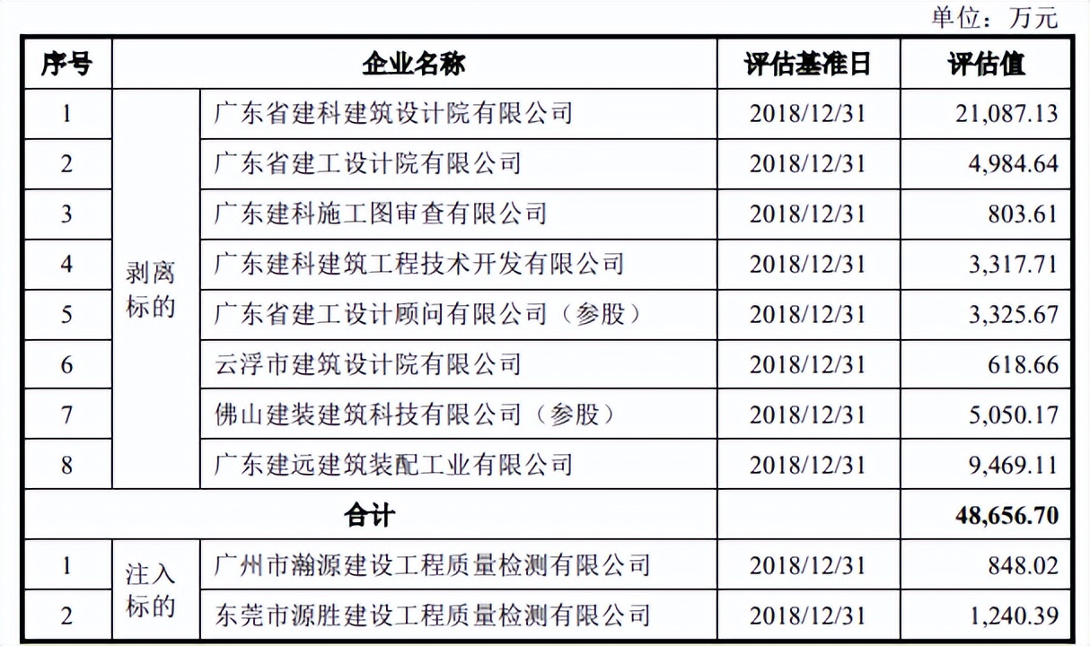 2019年,廣東建科啓動了“剝8注3”資產重組程序,即將公司旗下規劃設計、建築施工、裝配式建築業務板塊的8家公司剝離至廣東建工,而廣東建工將下屬從事檢驗檢測類業務的3家公司的股權注入廣東建科。