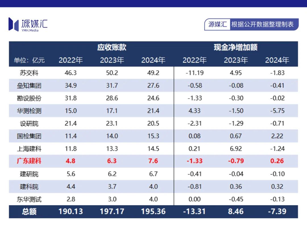 放眼整個建築檢驗檢測市場,11家相關上市公司幾乎面臨同樣的問題,合計應收賬款總額從190.1億元上漲至195.4億元。其中,廣東建科期間應收賬款新增金額僅次於華測檢測、國檢集團、蘇交科。