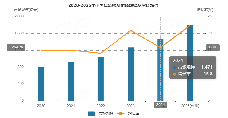 根據wind數據顯示,2024年,中國建築檢測市場規模達到1471億元,同比增長15.8%,預計2025年將達到1800億元,同比增長22.4%。增長動力主要來自城市更新需求、綠色建築檢測爆發、政策驅動三個方面。