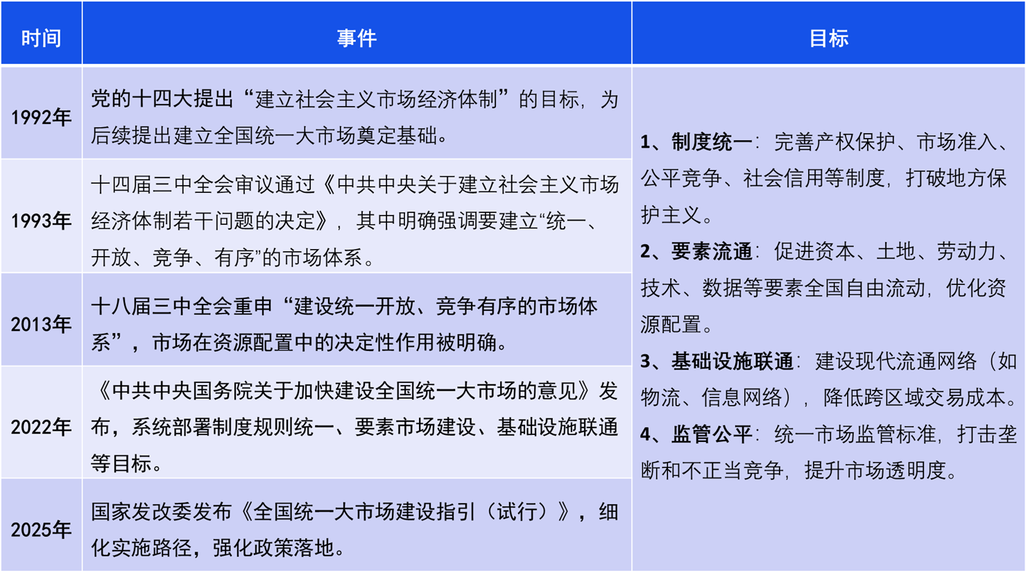 早在1992年,黨的十四大就提出“建立社會主義市場經濟體制”的目標,為後續提出建立全國統一大市場奠定基礎。隨後1993年,十四屆三中全會審議通過《中共中央關於建立社會主義市場經濟體制若干問題的決定》,其中明確強調要建立“統一、開放、競爭、有序”的市場體系,即全國統一大市場。