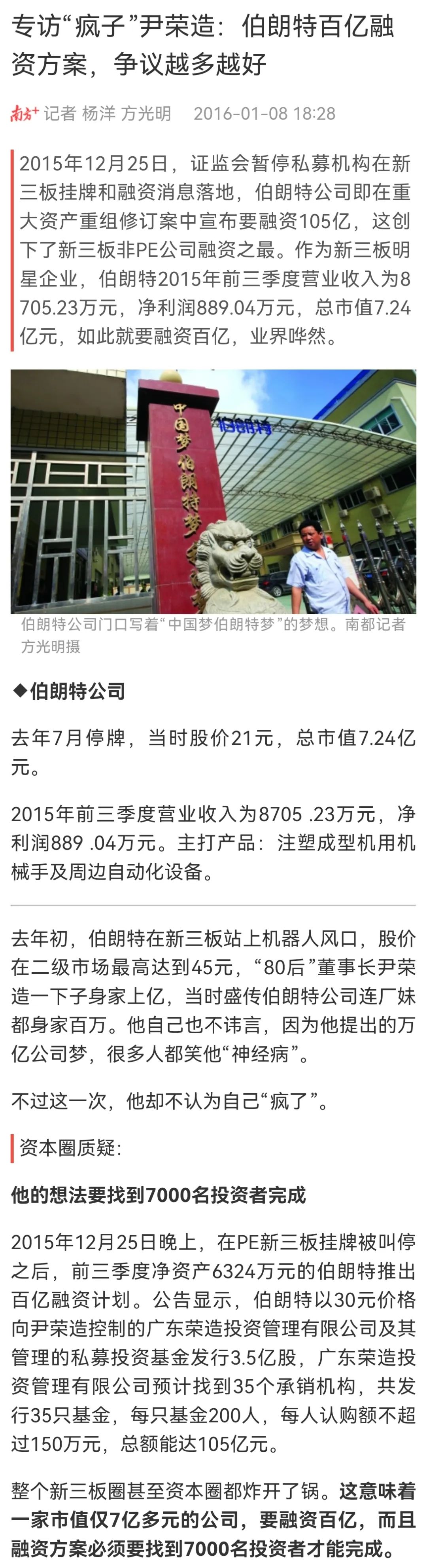 伯朗特以30元價格向尹榮造控制的廣東榮造投資管理有限公司及其管理的私募投資基金髮行3.5億股,廣東榮造投資管理有限公司預計找到35個承銷機構,共發行35只基金,每隻基金200人,每人認購額不超過150萬元,總額能達105億元。