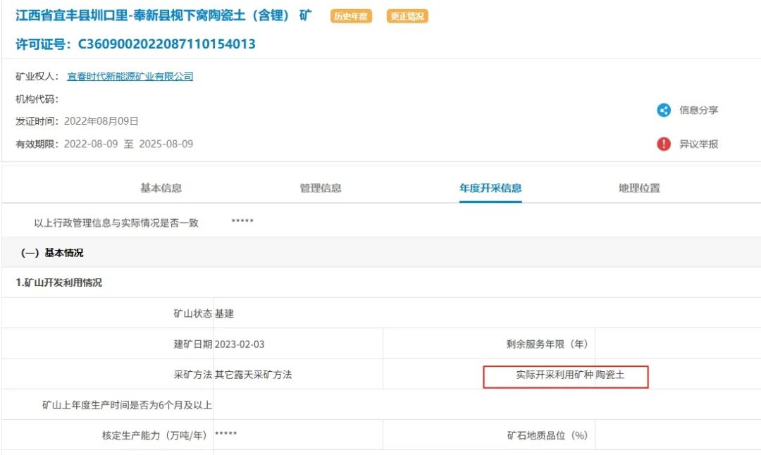 時代週報還注意到,宜春時代(持股30%)與江西永興特鋼新能源科技有限公司共同間接控股的宜豐縣花橋鄉白市化山瓷石礦、宜春時代(持股30%)與江西九嶺鋰業股份有限公司共同控股的花橋大港瓷土礦目前登記的實際開採礦種亦為陶瓷土,後者採礦證有效期至2029年12月24日。