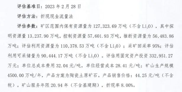 看起來該礦區儲量相當豐厚,但2023年《江西省宜豐縣圳口裏-奉新縣梘下窩礦區陶瓷土(含鋰)礦普查探礦權出讓收益評估報告書》中也明確指出,上述儲量數據中並不含氧化鋰。