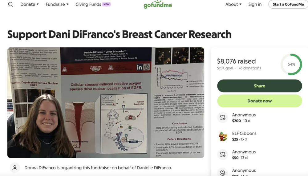 亞利桑那大學乳腺癌研究實驗室的分子和細胞生物學教授Joyce A. Schroeder和博士生Danielle DiFranco,今年5月也在 GoFundMe 發起了眾籌活動,目前已籌集到 6500 多美元。DiFranco表示,這筆錢可以用來購買實驗室每週使用的相對便宜的耗材,實驗室得以維持幾個月的運轉。