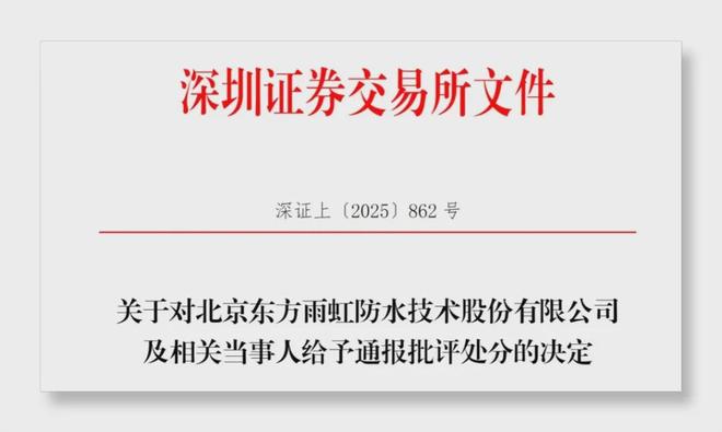 8月11日,東方雨虹因實際控制人、董事長李衞國非經營性佔用公司資金,被深圳證券交易所通報批評,同時收到中國證券監督管理委員會北京監管局的警示函。警示函顯示,公司存在關聯方非經營性資金佔用且未及時披露、財務核算不規範等問題。