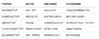 集羣效應顯著:各產業帶形成了完整的產業鏈和供應鏈,企業之間協同效應明顯。例如,長沙縣汽車及零部件產業帶涵蓋整車集成、電池系統、電機電控、智能網聯、汽車內飾等全產業領域,整車年設計產能112萬輛 ;雙峯農機擁有農機生產及配套企業90家,從業人員超3萬人,2024年農機規上企業產值達56.7億元,同比增長20.29%。