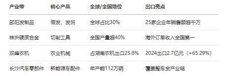 **特色鮮明:**各產業帶依託本地資源優勢,形成了差異化競爭優勢。例如,邵陽發製品產業帶全球佔比30%,是全球最大的發製品生產基地之一;株洲硬質合金產量在全國行業佔比超四成,海外訂單銷售收入穩居全國第一;雙峯農機出口額佔湖南省農機出口的25.8%,2024年出口額達2.7億元,同比增長65.29%。