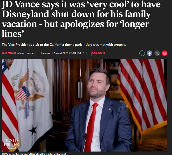 副總統JD萬斯對7月加州迪士尼樂園家庭之旅可能造成的任何干擾表示歉意——但並非深表歉意。