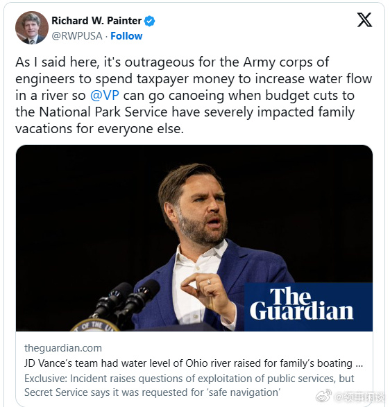 曾在喬治·W·布什政府擔任倫理律師的理查德·佩恩特在X(前身為推特)上的一篇帖子中對該行為進行了抨擊。佩恩特寫道:“正如我在這裏所説的,當其他人的家庭度假都因國家公園服務預算削減而受到嚴重影響時,美國陸軍工程兵團居然花費納税人的錢來增加河流的水流,以便副總統去劃獨木舟,這簡直令人憤慨。”
