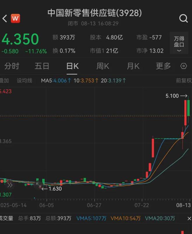 有趣的是,該公司的股價表現卻十分活躍。在過去一年多的時間裏,經歷了多次大幅波動。2024年7月,原控股股東宏德控股向Alpine Treasure出售75%股權,涉及3.6億股,現金價為1億港元,相當於每股作價0.2778港元,收購價較停牌前折讓約78.79%。復牌後,公司股價大漲,一度漲近4港元/股 。隨後在四季度出現調整,2025年1月,S&T HLDGS正式更名為中國新零售供應鏈,又引發一波上漲,隨後股價一度跌至1.6港元/股附近。而在本次收購停牌前,中國新零售供應鏈股價突然連續大漲,3個交易日上漲近75%,復牌之後的兩個交易日,公司股價再度上漲近40%。