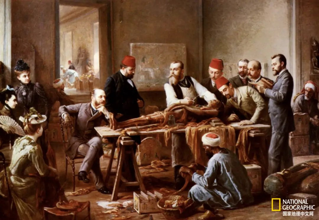 在這幅由法國藝術家保羅·菲利波託(Paul Philippoteaux)於19世紀末創作的油畫中,考古學家們正參與對阿蒙神女祭司塔-烏扎-拉(Ta-Uza-Ra)木乃伊的拆解儀式。維多利亞時代盛行“埃及熱”,使得木乃伊拆解派對成為一種廣受歡迎的消遣方式。|國家地理圖片集