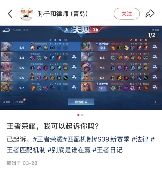這位玩家名叫孫千和,她同時也是一名律師。自今年3月底開始,她就在小紅書上陸續發表帖子,表達她對《王者榮耀》匹配機制的懷疑,並計劃起訴遊戲。