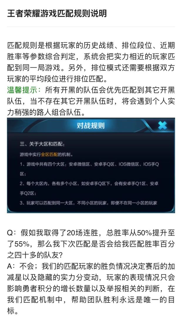 而2018年,騰訊在發佈《匹配算法全面解析》時,已經公示過《王者榮耀》使用的匹配機制為ELO等級分系統,指出“匹配模式是完全按照ELO值匹配隊友和對手;排位賽是按照段位水平和ELO值綜合評判並匹配的”,並通過更新日誌,如“新的算法將會更關注每條分路是否公平”、“優化方向為減小段位內實力差距”,表明了ELO值的受影響因素,履行了對玩家知情權的合理保障義務。