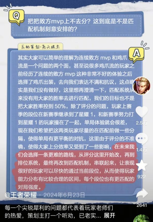 《王者榮耀》在這10年裏也做了不少嘗試,他們從2018年的ELO機制,逐步發展到2022年的MMR機制,再到如今的匹配機制,遊戲一直在優化機制邏輯和體驗,並和玩家們不斷解釋和溝通。倘若《王者榮耀》在這方面的體驗真的差到「引起公憤」的程度,或許它也不會成為世界上日活躍人數最高的遊戲。
