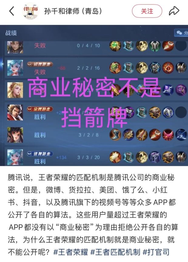 但騰訊認為,公開並非法定義務,且《王者榮耀》已經對匹配機制原理給出了足夠的解釋,公開邏輯與抖音並無太大差別。