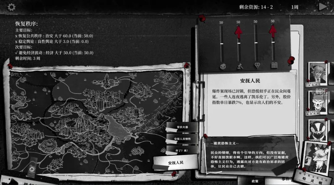 比起之前更偏概念上的“頒佈政策”,現在的版本會有更多敍事上的具體任務乃至緊急事件需要處理。“我們會在幾個回合內給玩家一個階段性目標,比如處理政府大樓爆炸案帶來的後續影響。”大貓頭鷹給我演示了遊戲的基礎循環,“這個事件可能會讓社會產生一些變化,經濟上、股票市場上可能也有影響……這個兇手可能是國際恐怖組織或者別的什麼人,你要在輿論上去怎麼引導……”如果玩家無法完成這些階段性目標,遊戲就會失敗。