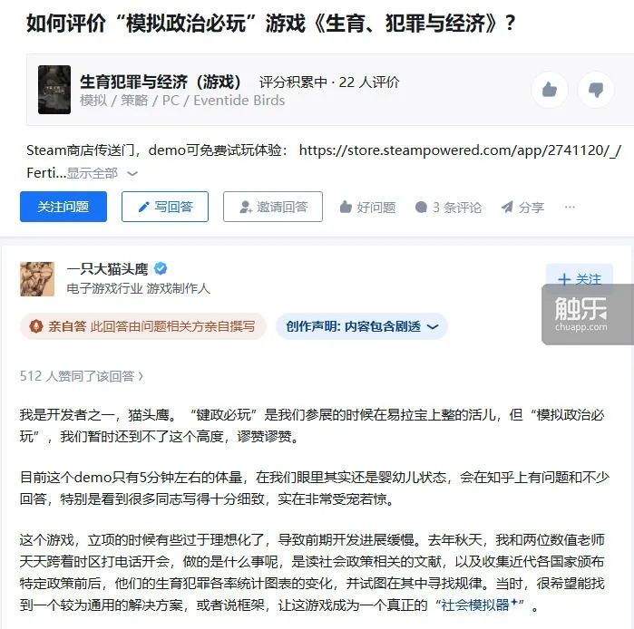 因為好奇這個“社科氣質”的團隊如何克服這些問題,觸樂同知乎合作,找到大貓頭鷹聊了聊。令人有些驚訝的是,她的心態比預想中要平穩和按部就班許多。而且,面對這個預期收益沒那麼樂觀的項目,工作室在業界所收穫的幫助比預想中多。