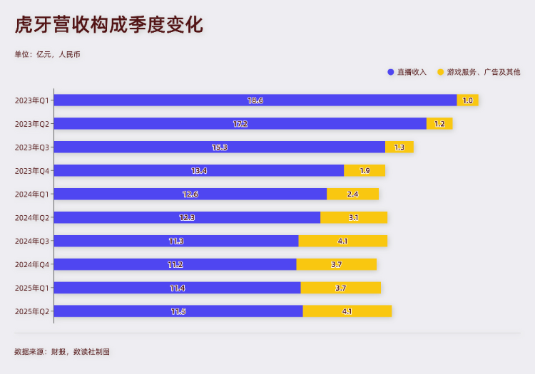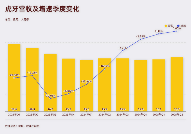 但2025年,虎牙終於止住了下滑態勢。今年二季度,虎牙營收15.7億元,同比微增1.65%,連續第二個季度同比增長。
