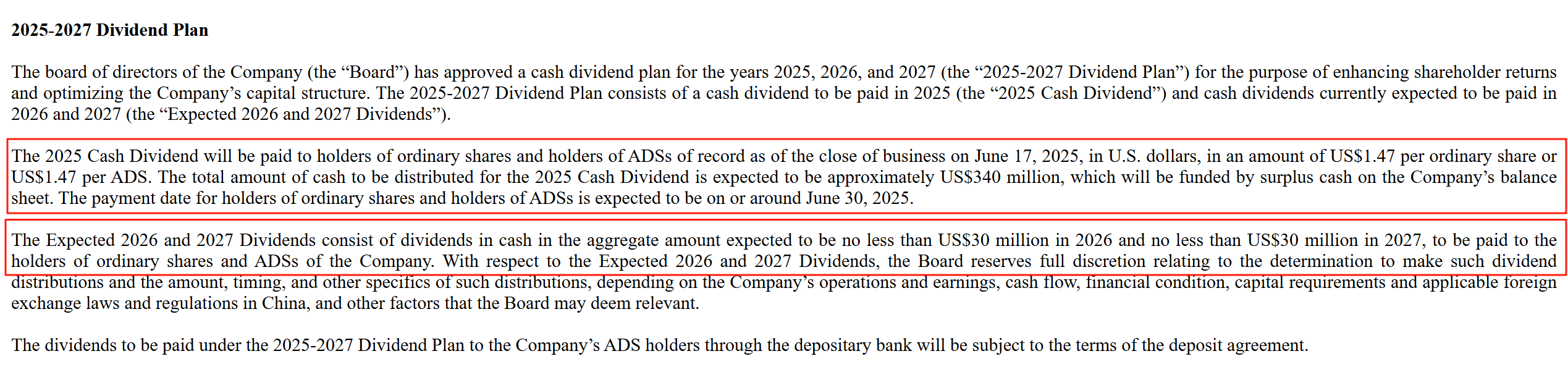 2024年年報中,虎牙宣佈“三年股息計劃”,預期總派息金額不少於4億美元(約人民幣28.73億元),包括在2025年支付的現金股息3.4億美元,以及預期在2026年和2027年支付的現金股息每年不少於3000萬美元。