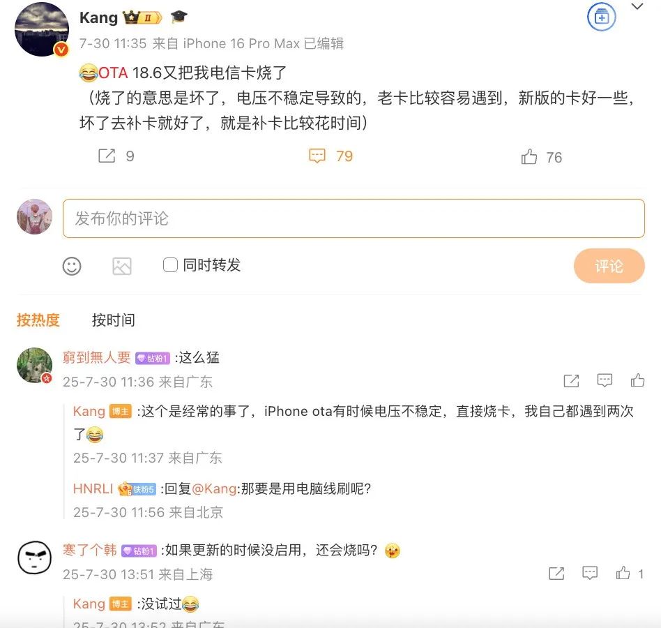 而且有不少 iPhone 用户説手機在 OTA 之後會有概率 “燒 SIM 卡”,其中一條吐槽還是數碼博主康總@kang 發的。