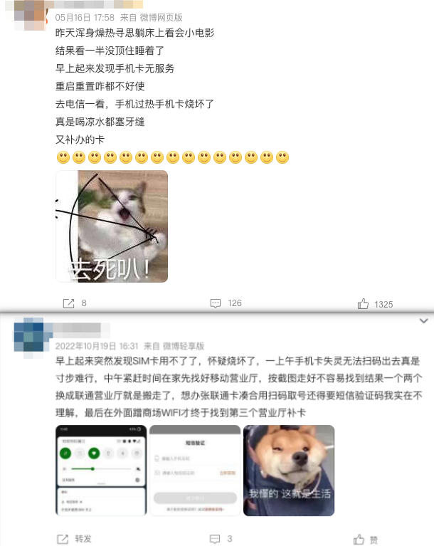 我們上微博一搜,發現遇到米羅這種情況的人還有不少,都説是用着用着就無服務了,去營業廳一看發現 SIM 卡燒了。