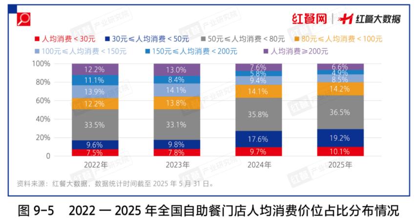 從自助餐的人均消費來看,人均消費在100元以下的“平價自助”門店數量佔比持續增長。紅餐大數據顯示,截至2025年5月,人均消費在100元以下的自助餐門店數佔比為 80%,這一比例較2022年提升了17.2個百分點。