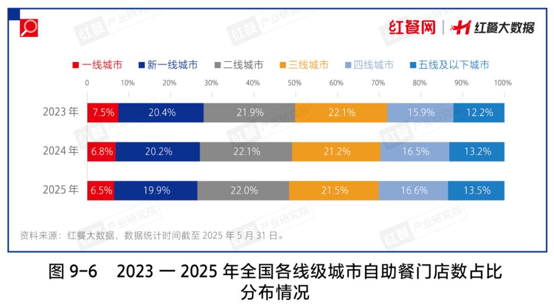 紅餐大數據顯示,截至2025年5月,全國三線及以下城市的自助餐門店數佔比為51.6%,比2024年提高了0.7個百分點,比2023年提高了1.4個百分點。