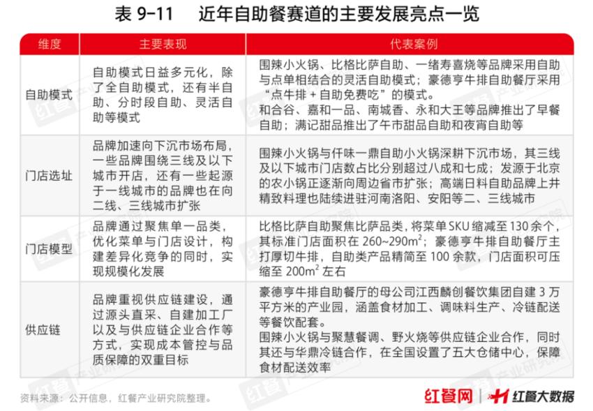此外,諸如麪包自助、麪館自助、餃子自助、小龍蝦自助、麻辣燙自助、快餐自助、早茶自助等不同類型的自助餐廳也在不斷湧現。而一些非自助餐領域的品牌也引入了自助模式,以提升消費者體驗和拓寬消費場景,如慶豐包子鋪、滿記甜品、南城香、永和大王、必勝客等,粵菜品牌金鼎軒還在北京開出了首家自助餐廳。