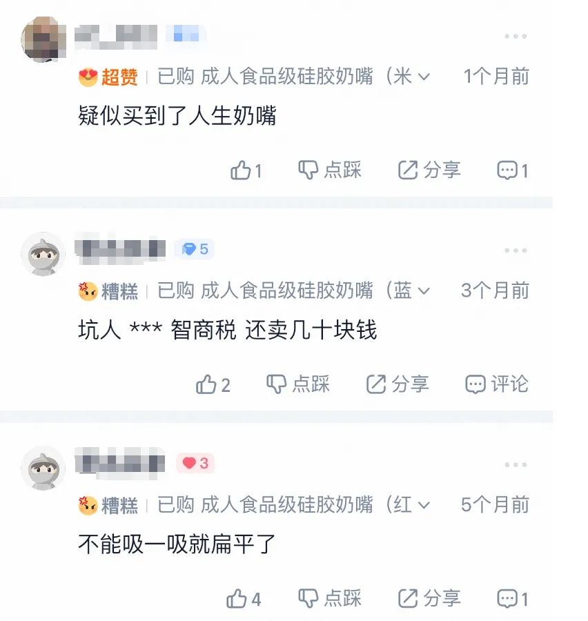 相比幫嬰幼兒購買奶嘴時的精挑細選,成人奶嘴購買者很多都是抱着**“解壓玩具”**定位去的,很容易忽略這東西最終進的是自己嘴巴,尤其還圖便宜買了最廉價非品牌的產品。