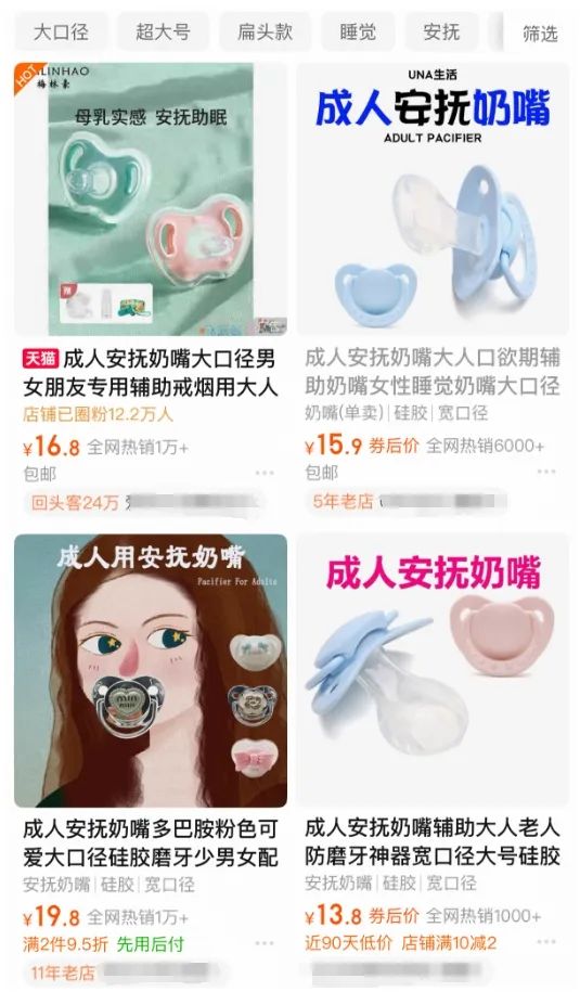 從銷售數據上看,多家售賣成人安撫奶嘴的商家均已月銷破千,銷量最高的店鋪曾月銷破萬,簡直稱得上是**“互聯網虛假繁榮嬰兒潮”**,嬰幼兒產品商家還在感受新生兒鋭減的寒意,結果成人奶嘴給賣爆了。