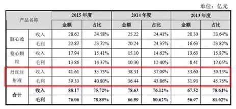 但根據步長製藥上市前的招股説明書,在2013年至2015年期間,丹紅注射液的年銷售金額分別高達41.61億、38.31億和33.6億,合計113.52億。收入佔比超過30%,利潤佔比更穩居40%以上。