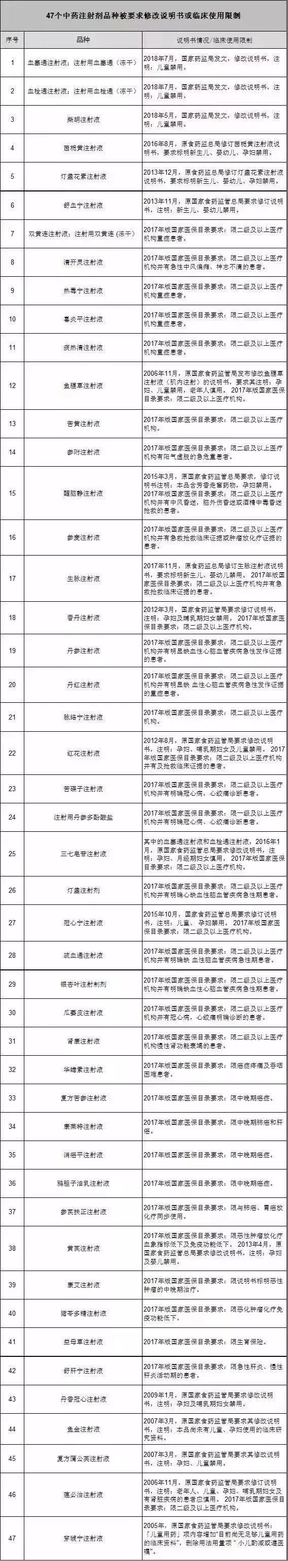 從2015年起,有超過47種中藥注射劑被限,被要求修改説明書或臨牀使用限制。
